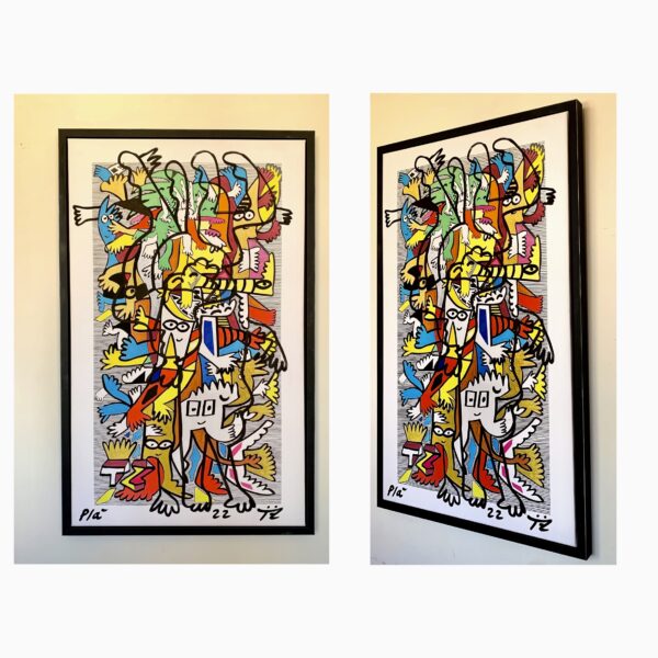 VENDIDO – Totoy Zamudio: Grabado digital sobre tela, intervenido con dibujo en acrílico. (ENMARCADO).